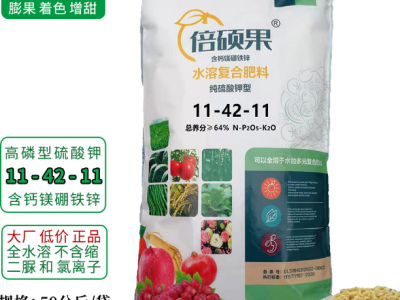 倍硕果高磷型11-42-11复合肥料,是一种可以全水溶的多元营养复合肥料,由优质的氮磷钾三种大量元素复配螯合态钙镁硼铁锌生产而成。产品具有全水溶,易吸收,营养全,肥料利用率高,使用安全方便等特点。肥料养分释放平稳,肥效快且长。本品高磷配方,补磷益花,催花促花,果实饱满。尤其适合缺磷土壤和结果观花类作物使用。对各种果树、瓜果、蔬菜、药材、绿化、花卉、大田作物、油类作物等具有针对性,科学合理施用能有效提高作物产量和品质。